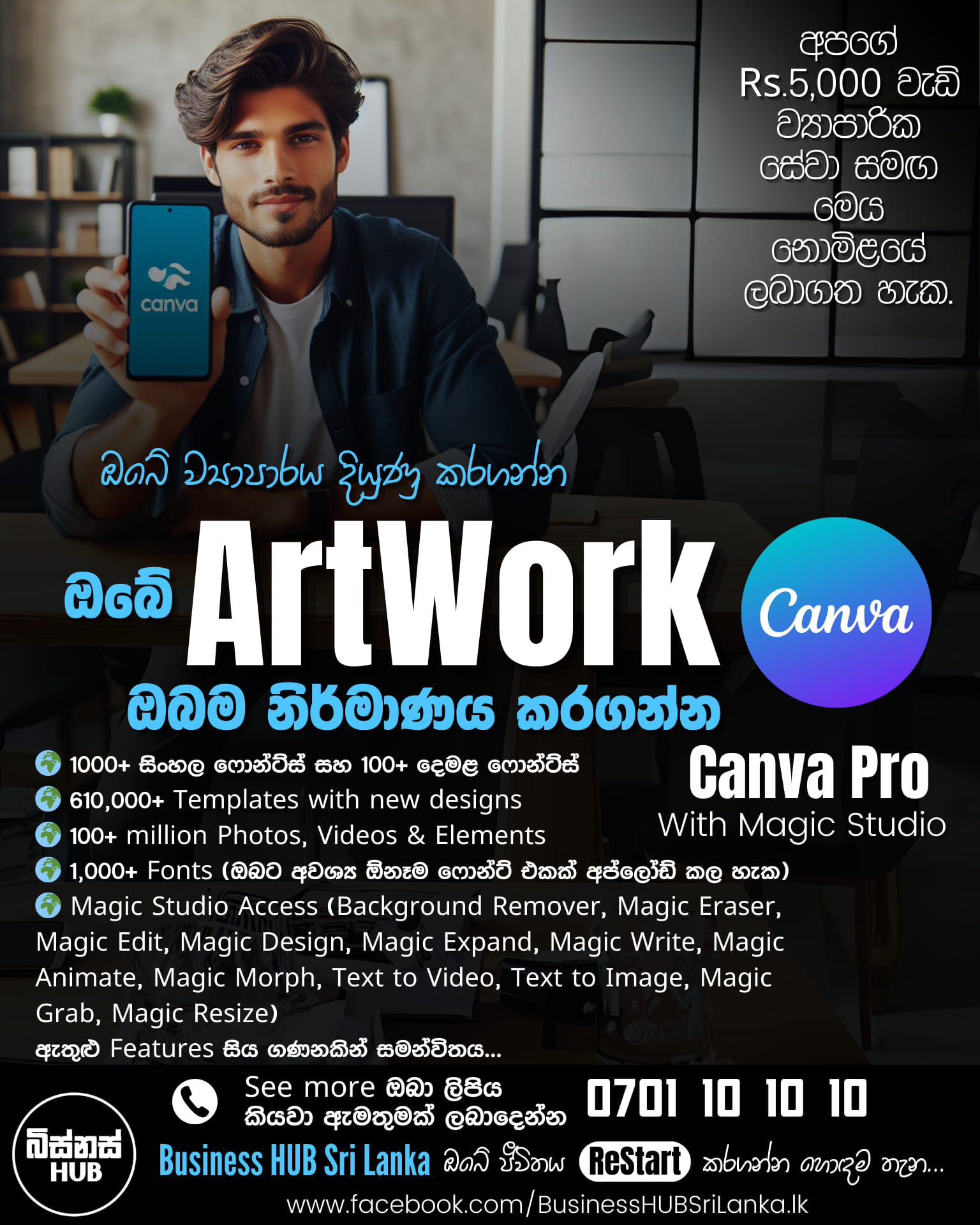 ඔබේ ව්යාපාරය දියුණු කරගන්න ඔබේ Artwork විනාඩි 2න් ඔබම නිර්මාණය කරගන්න... Canva Pro (Edu) with Magic Studio & AI 🌍 1000+ සිංහල ෆොන්ට්ස් සහ...