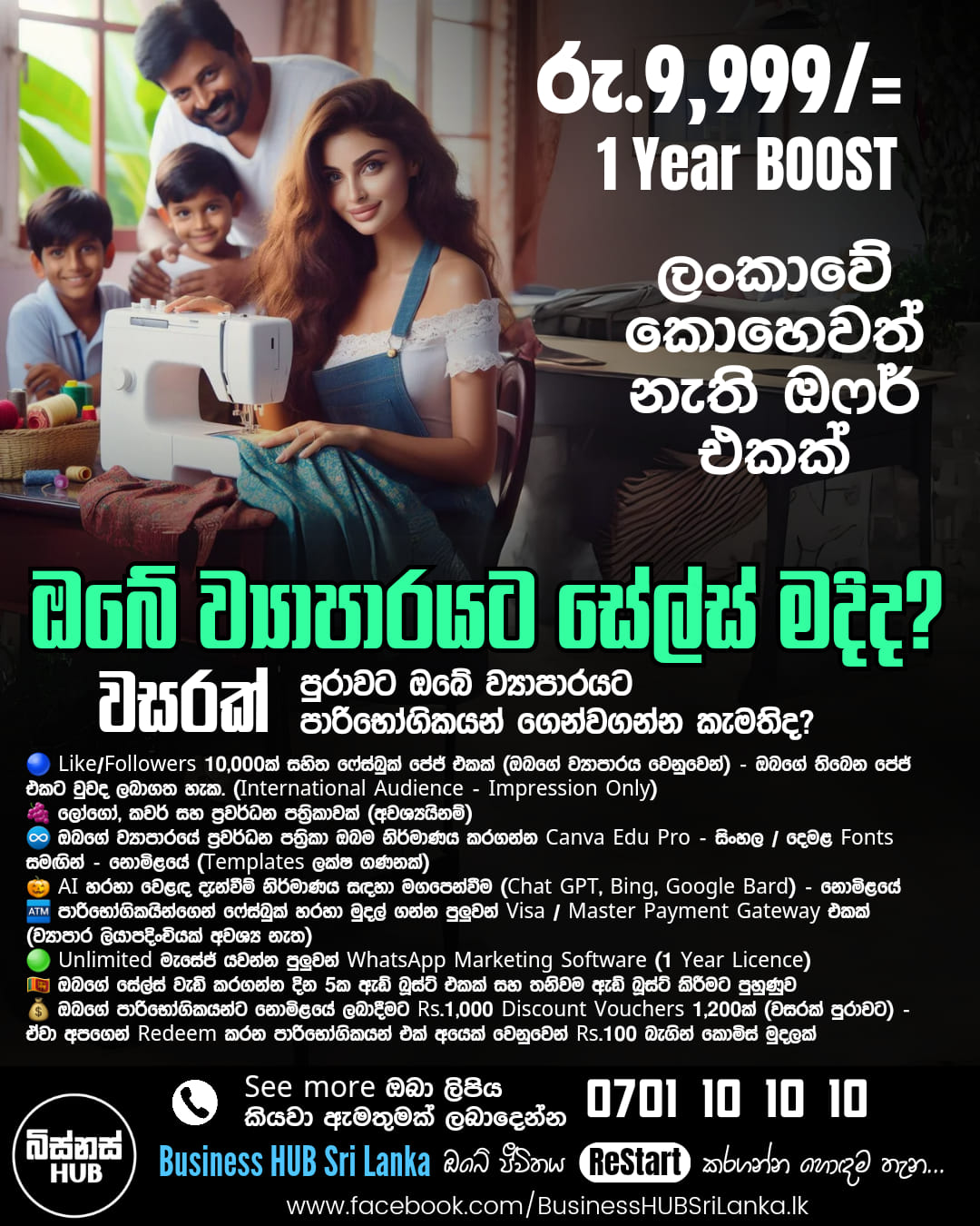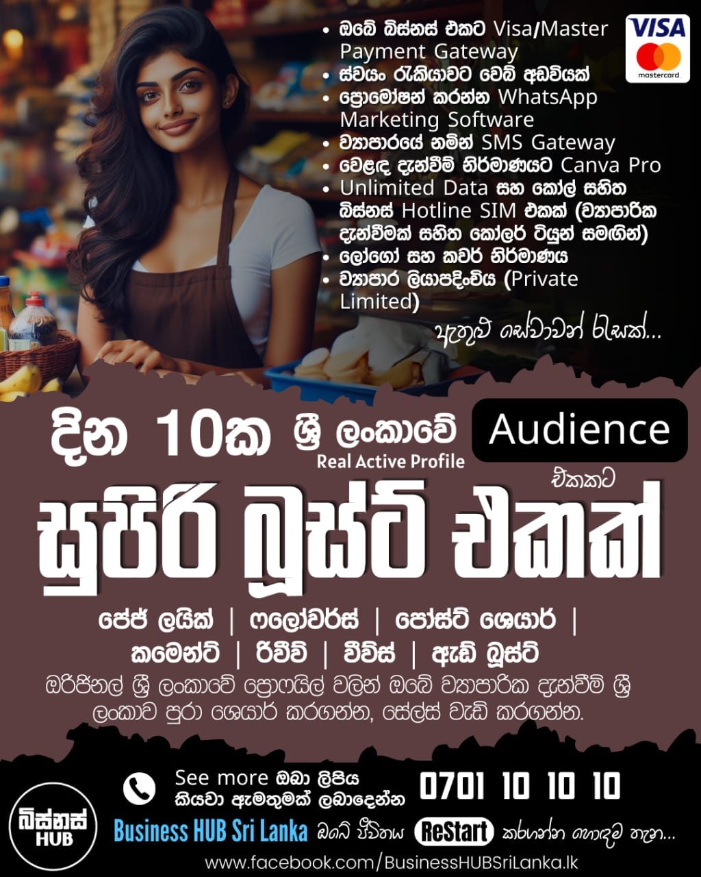 ඔබේ ව්යාපාරයට සුපිරි Boost එකක්... වැඩි විස්තර සඳහා අමතන්න 0701101010 Details අවශ්යයිනම් පහත වට්ස් ඇප් බොත්තම...