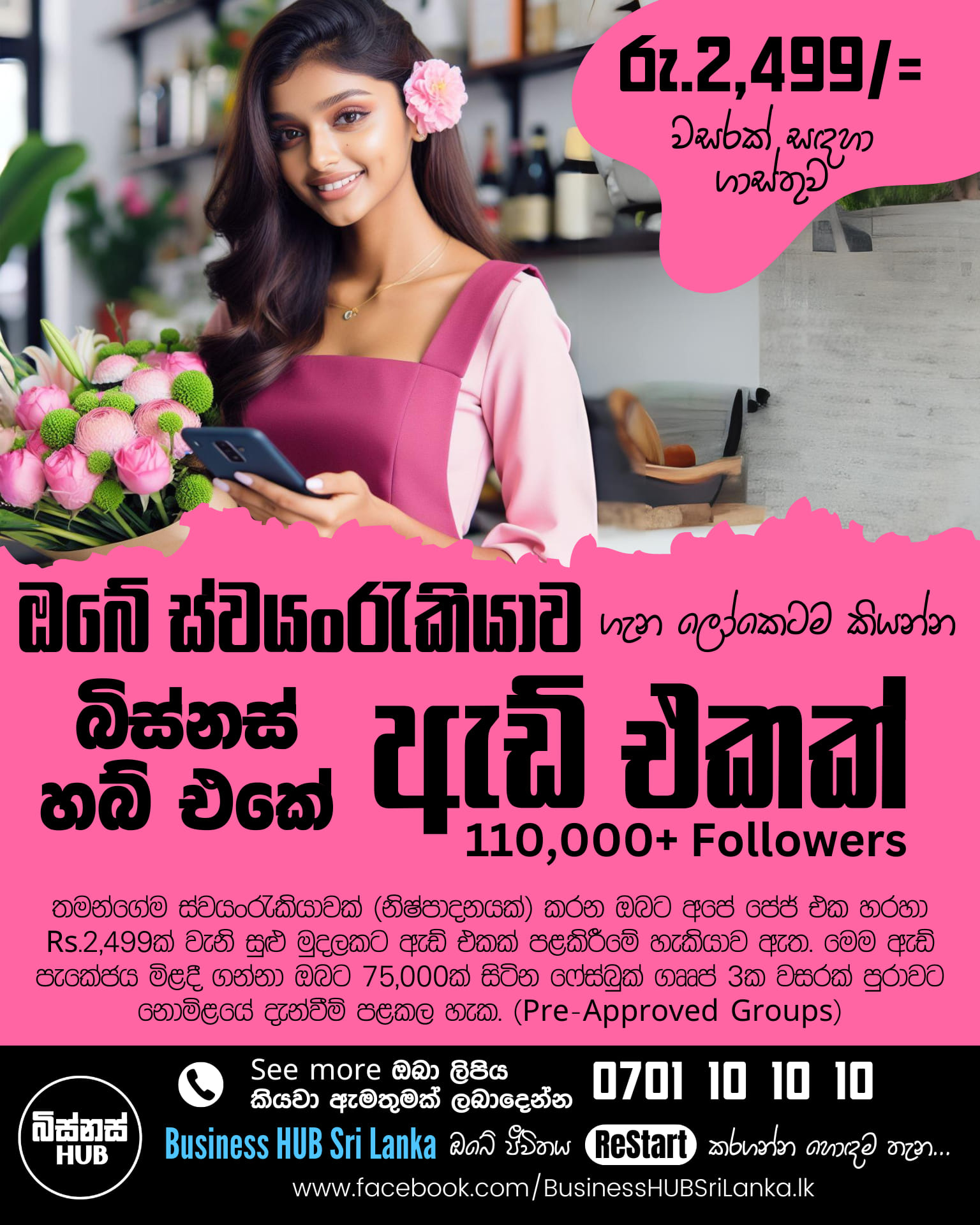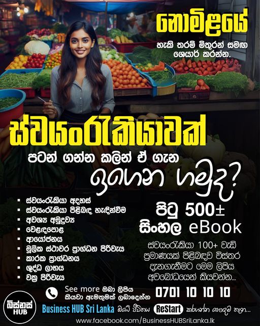 ඔබේ ස්වයංරැකියාව ගැන ලෝකෙටම කියන්න බිස්නස් HUB එකේ ඇඩ් එකක් දාමුද? 💰 රු.2,499/=ක් පමණයි (වසරක් සඳහා ගාස්තුව) තමන්ගේම ස්වයංරැකියාවක් (නිෂ්පාදනයක්)...