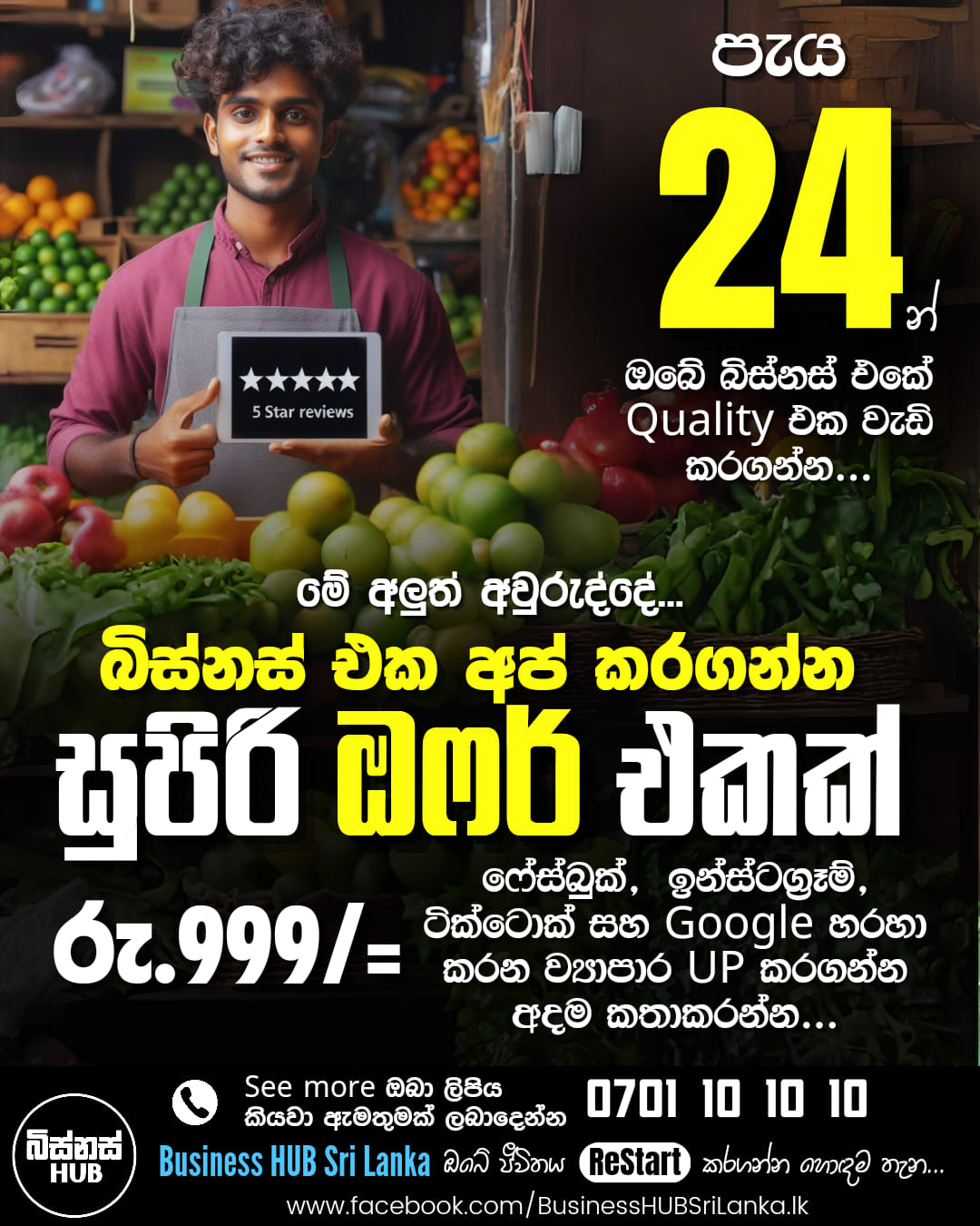 බිස්නස් එක UP කරගන්න සුපිරි ඔෆර් එකක් | පැය 24න් ඔබේ බිස්නස් එකේ Quality එක වැඩි කරගන්න කැමතිද? ෆේස්බුක්, ඉන්ස්ටග්රෑම්, ටික්ටොක් සහ Google හරහා...
