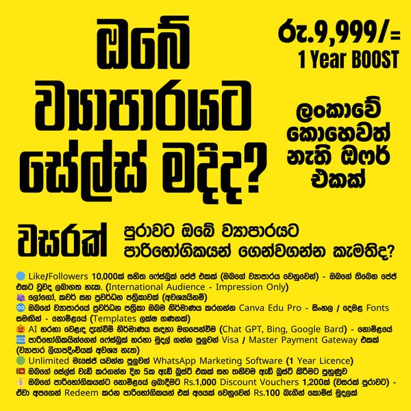 ඔබේ ව්යාපාරයට සුපිරි Boost එකක්... වැඩි විස්තර සඳහා අමතන්න 0701101010 Details අවශ්යයිනම් පහත වට්ස් ඇප් බොත්තම...