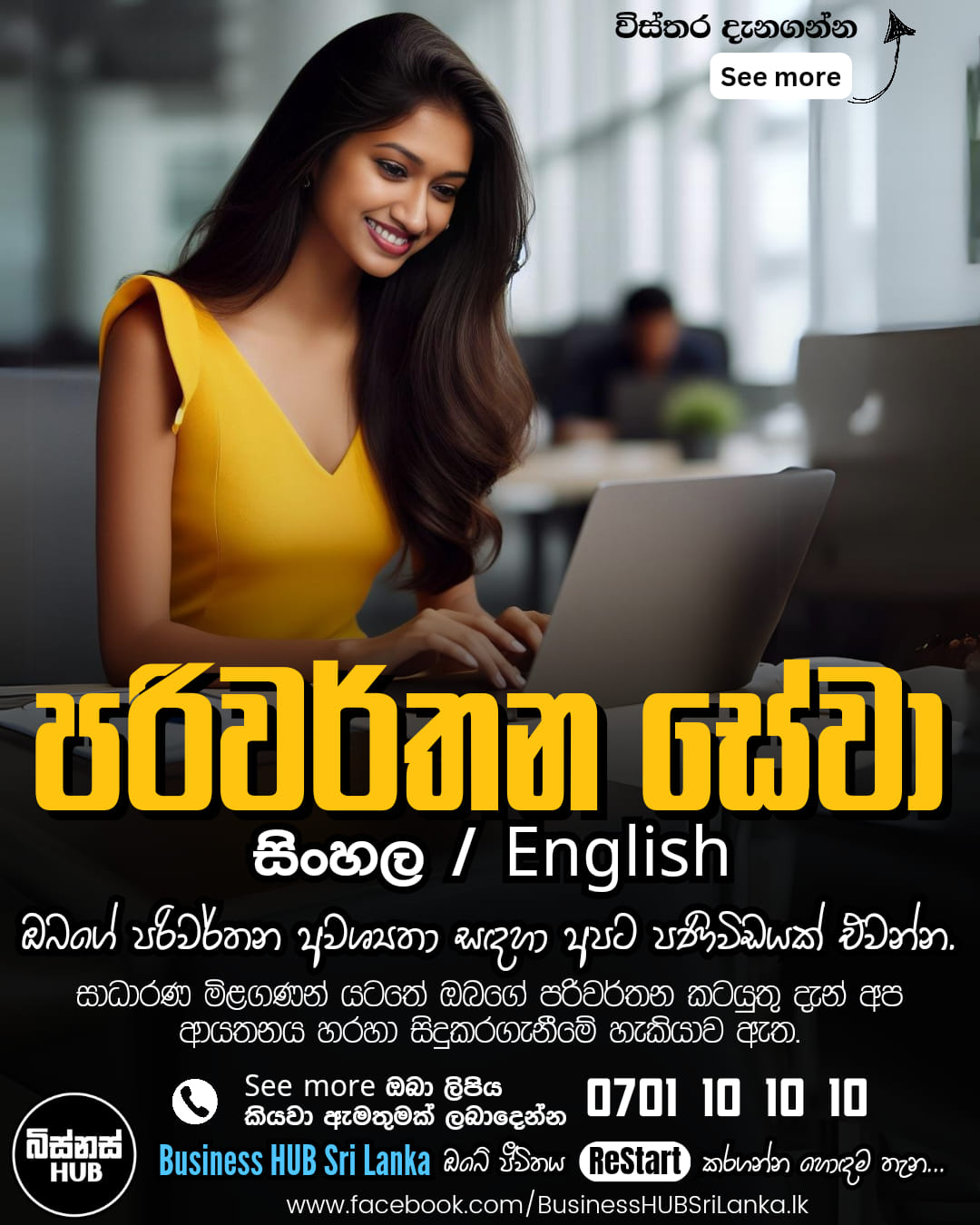 පරිවර්තන සේවා (Translation Services) - සිංහල / English ඔබගේ පරිවර්තන අවශ්යතා සඳහා අපට පණිවිඩයක් එවන්න. සාධාරණ මිළ ගණන් යටතේ ඔබගේ පරිවර්තන කටයුතු...