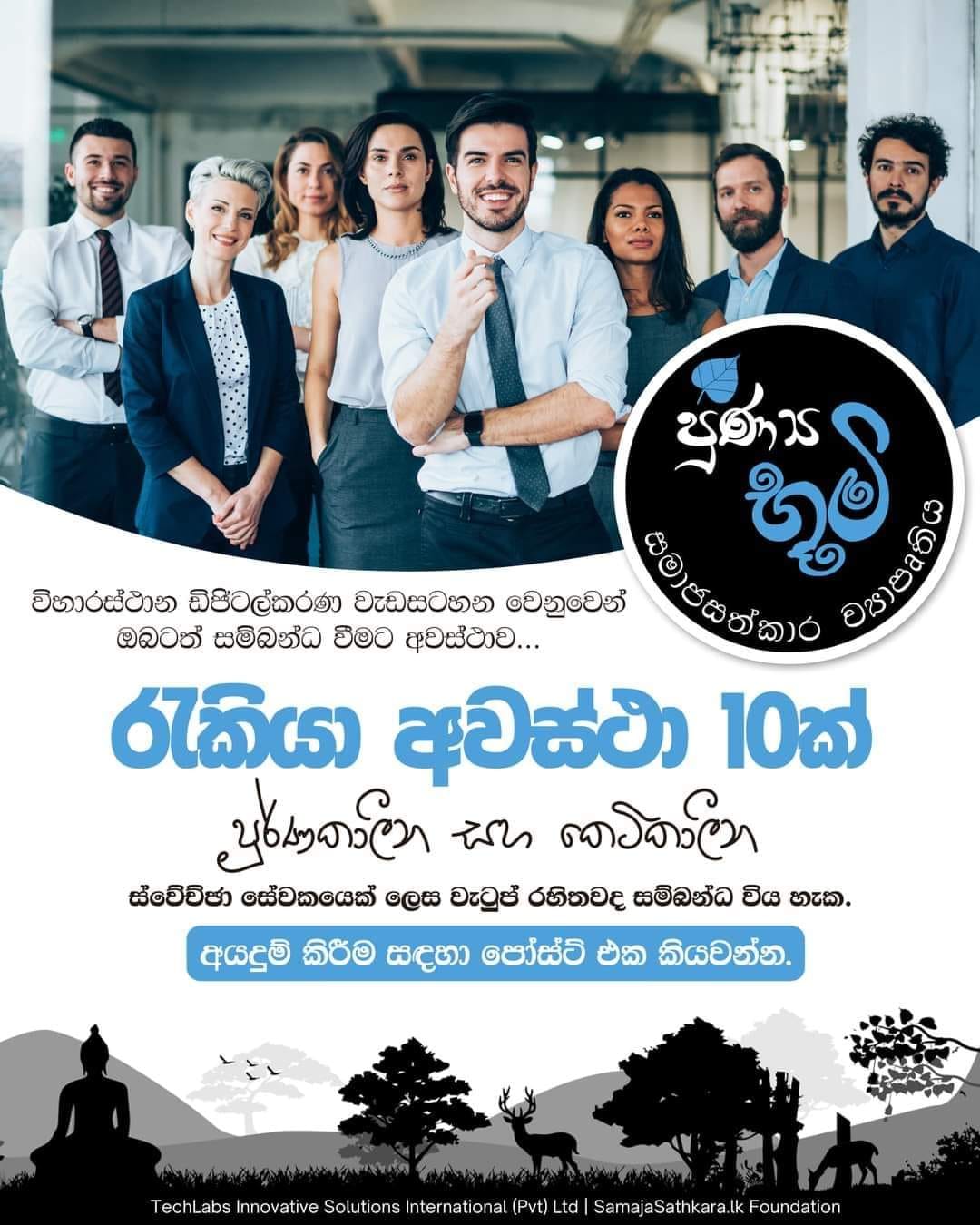 රැකියා අවස්ථා 10ක් - පූර්ණකාලීන සහ කෙටිකාලීන "පුණ්යභූමි - පන්සලට වෙබ් අඩවියක් ජාතික මෙහෙවර" නමැති විහාරස්ථාන ඩිජිටල්කරණ වැඩසටහන වෙනුවෙන් ඔබටත්...