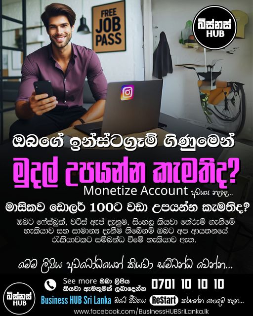 ඔබගේ Instagram ගිණුමෙන් මුදල් උපයන්න කැමතිද? Monetize Account අවශ්ය නැහැ. මාසිකව ඩොලර් 100 වඩා උපයන්න කැමතිද? | Business HUB FREE JOB PASS මෙම...