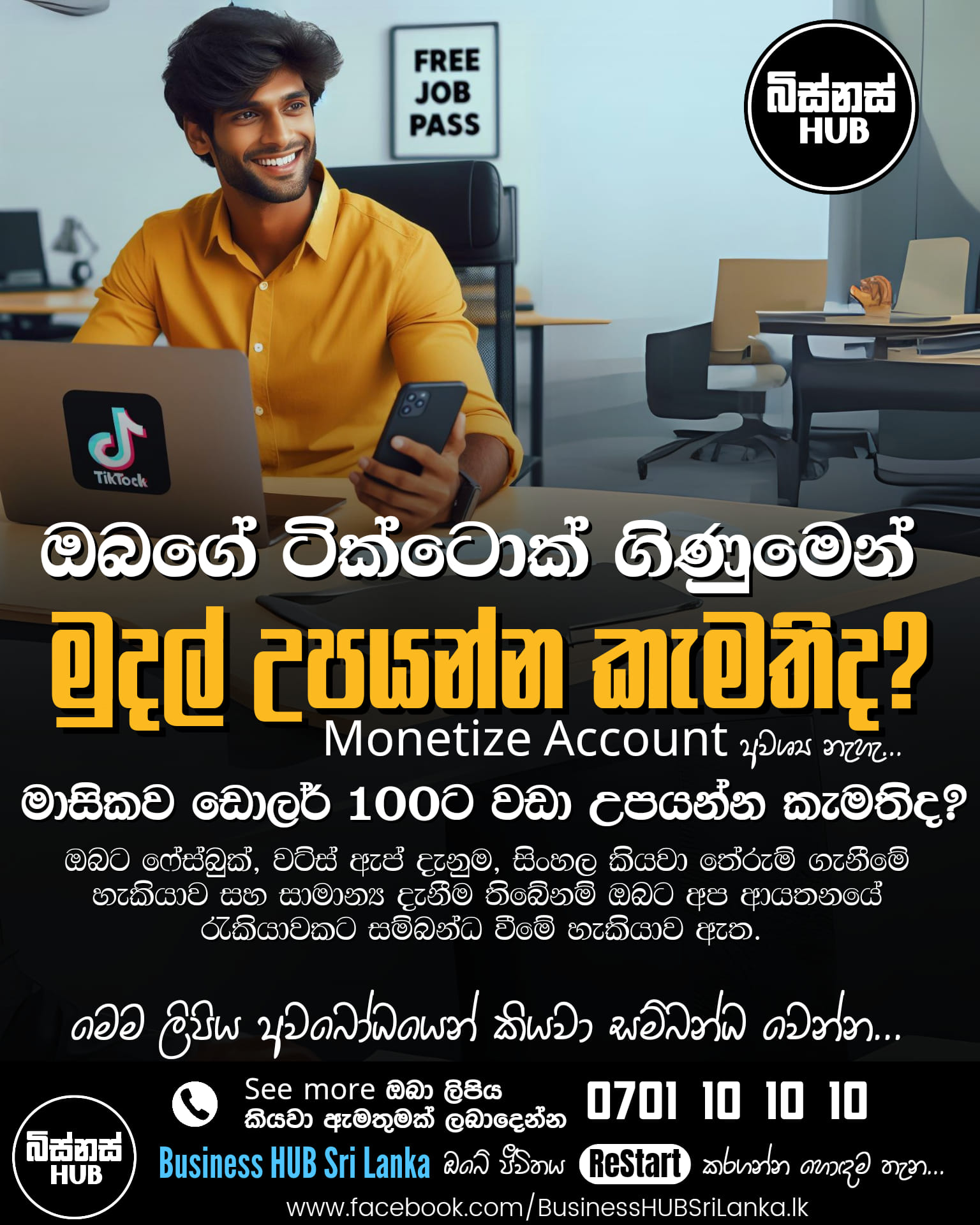 ඔබගේ Tiktok ගිණුමෙන් මුදල් උපයන්න කැමතිද? Monetize Account අවශ්ය නැහැ. මාසිකව ඩොලර් 100 වඩා උපයන්න කැමතිද? | Business HUB FREE JOB PASS මෙම...