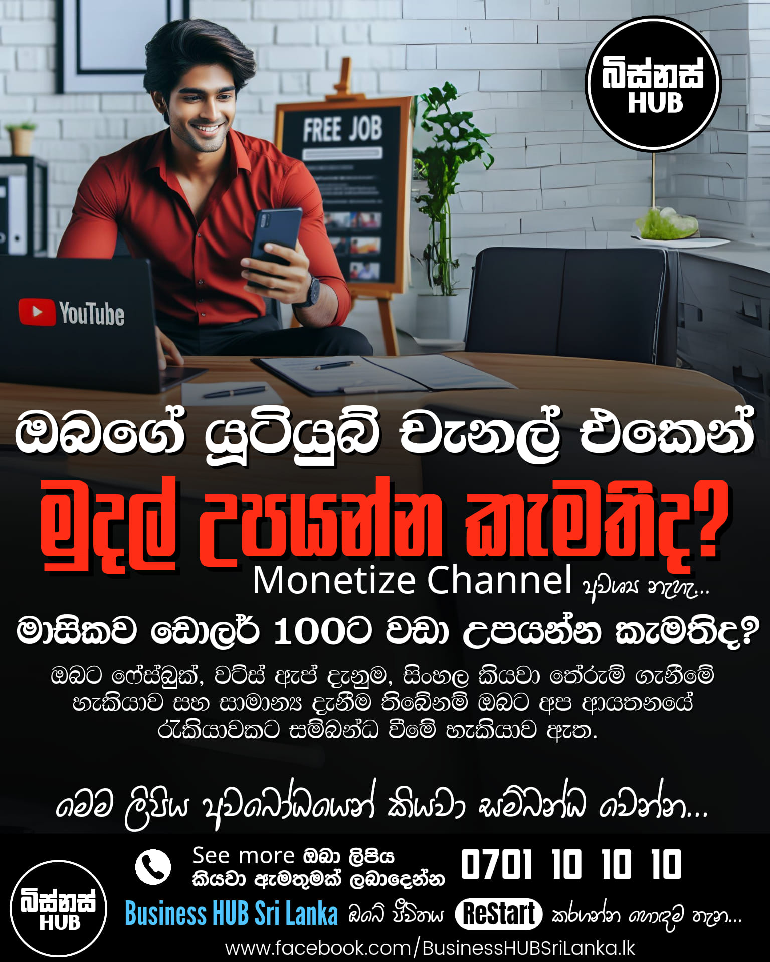 ඔබගේ Youtube Channel එකෙන් මුදල් උපයන්න කැමතිද? Monetize Channel අවශ්ය නැහැ. මාසිකව ඩොලර් 100 වඩා උපයන්න කැමතිද? | Business HUB FREE JOB PASS...